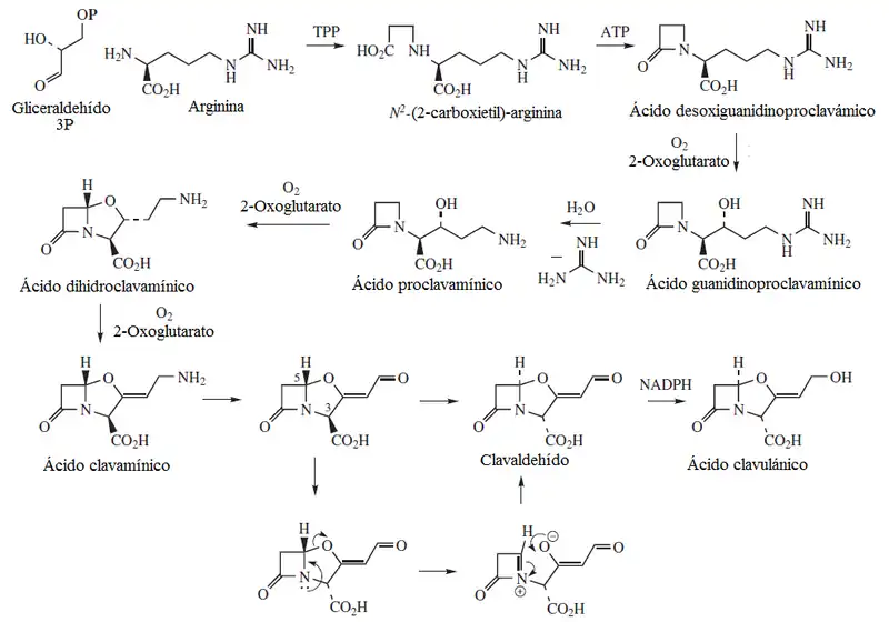 Su nombre se deriva del microorganismo Streptomyces clavuligerus, que produce ácido clavulánico.[2][3] El ácido clavulánico es biosintéticamente generado del aminoácido arginina y del monosacárido gliceraldehído-3-fosfato.