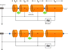 Este tipo de acelerador se compone de un número variable de tubos cilíndricos. Los tubos alternos están conectados entre sí, de tal modo que se aplique una diferencia de potencial oscilante entre los dos conjuntos de tubos. Debido a esta diferencia de potencial, las partículas cargadas experimentan una aceleración en el espacio entre los tubos; una vez que penetran en el tubo, este actúa como una caja de Faraday, aislándolas del campo eléctrico oscilante hasta que emergen en el otro extremo, donde experimentan un nuevo empuje. El tiempo que tardan las partículas en atravesar el tubo debe ser constante para mantenerse sincronizado con el período de oscilación del campo eléctrico. Como la velocidad de las partículas se incrementa a medida que viajan a lo largo del acelerador, los tubos deben tener mayor longitud a mayor distancia de la fuente.[1] Los primeros aceleradores de este tipo funcionaban bien con partículas pesadas como iones, pero eran incapaces de impartir altas energías a partículas subatómicas como protones o electrones. Debido a su poca masa, estas partículas alcanzan una velocidad cercana a la de la luz y se requiere un campo oscilante a frecuencias del orden de gigaherzios.[3] Los klistrones, aparatos inventados en 1937 y capaces de generar estas radiofrecuencias se empezaron a emplear para usos no militares al finalizar la Segunda Guerra Mundial. Al mismo tiempo, Luis Álvarez, junto con otros colaboradores de la Universidad de California, propuso emplazar el acelerador en una cavidad resonante para confinar el campo electromagnético y limitar las pérdidas por radiación.[2] Este diseño, con algunas modificaciones, se suele usar para aceleradores de protones.[6]