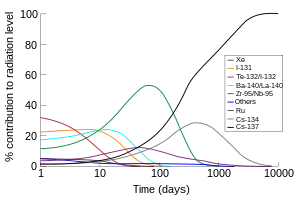 El yoduro de potasio se ha distribuido a poblaciones expuestas a accidentes de fisión nuclear como el accidente de Chernobyl. La solución de yoduro SSKI, una solución saturada de yoduro de potasio (K) en agua, se ha utilizado para bloquear la absorción del yodo radioactivo (no tiene ningún efecto sobre otros radioisótopos de la fisión). Los comprimidos que contienen yoduro de potasio también son fabricados y almacenados en centros de desastre central por algunos gobiernos para este propósito. En teoría, muchos efectos perjudiciales del cáncer nuclear tardío pueden ser prevenidos de esta manera, ya que un exceso de cáncer de tiroides, presumiblemente debido a la absorción de yodo radioactivo, es el único efecto probado de contaminación por radioisótopos después de un accidente de fisión o de contaminación por precipitaciones de una bomba atómica (la radiación inmediata de la bomba también causa otros cánceres, como leucemias, directamente). Tomar grandes cantidades de yoduro satura los receptores tiroideos e impide la absorción de la mayor parte del 131I radiactivo que puede estar presente por exposición al producto de fisión (aunque no protege de otros radioisótopos ni de ninguna otra forma de radiación directa). El efecto protector de yoduro de potasio dura aproximadamente 24 horas, por lo que debe ser dosificado diariamente hasta que ya no exista un riesgo de exposición significativa a radioyodo.[7][8] El yodo-131 (el contaminante radioactivo más común en las precipitaciones) también se desintegra relativamente más rápido, con un periodo de semideintegración de ocho días, por lo que el 99,95% del yodo original desaparece al cabo de tres meses.
