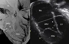 ![]() Ecocardiografia de una anomalía de Ebstein: Abreviaturas: RA: aurícula derecha; LA: aurícula izquierda; ARV: ventrículo derecho atrializado; LV: ventrículo izquierdo. | ||