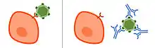 Para ingresar a las células, las partículas de virus y las bacterias intracelulares usan moléculas en sus superficies para interactuar con los receptores de la superficie celular de su célula objetivo, lo que les permite ingresar a la célula y comenzar su ciclo de replicación.[3] Los anticuerpos neutralizantes pueden inhibir la infectividad al unirse al patógeno y bloquear las moléculas necesarias para la entrada celular.Esto puede deberse a que los anticuerpos interfieren estáticamente con los patógenos o toxinas que se unen a los receptores de la célula huésped. En caso de una infección viral, los NAb pueden unirse a las glucoproteínas de los virus con envoltura o las proteínas de la cápside de los virus sin envoltura. Además, los anticuerpos neutralizantes pueden actuar evitando que las partículas experimenten cambios estructurales que a menudo se necesitan para una entrada celular exitosa. Por ejemplo, los anticuerpos neutralizantes pueden prevenir los cambios conformacionales de las proteínas virales que median la fusión de la membrana necesaria para ingresar a la célula huésped.En algunos casos,[3] el virus no puede infectar incluso después de que el anticuerpo se disocia. El complejo patógeno-anticuerpo eventualmente es absorbido y degradado por los macrófagos.[4]