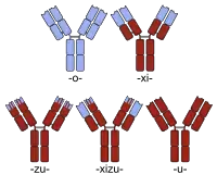 La denominación de quimeras humanizadas incluye la raíz de ambas designaciones ( -xi- + -zu- ). El Otelixizumab es un ejemplo de quimera humanizada que se encuentra actualmente en ensayos clínicos para el tratamiento de la artritis reumatoide y la diabetes mellitus.[4]