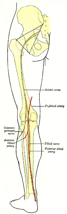 ![]() Extremidad inferior izquierda vista desde atrás. Arteria tibial posterior etiquetada abajo a la derecha. | ||