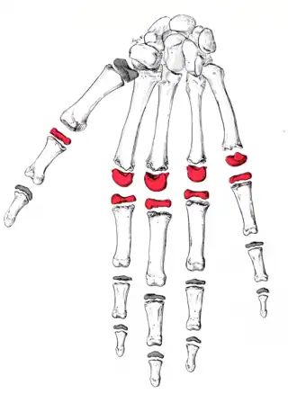 ![]() Las articulaciones DIF, PIF y MCF de la mano: MetaCarpoFalángica, y las articulaciones interfalángicas de la mano: