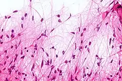 Microscópicamente, el tumor muestra un patrón bifásico, con células bipolares compactas de forma pilosa (de ahí su denominación "pilocítico") con largos procesos positivos para GFAP y zonas hipocelulares con microquistes. En las zonas sólidas, la neoplasia se compone de astrocitos neoplásicos con un citoplasma fibrilar intensamente eosinofílico y núcleos alargados y redondeados sin atipias. En las zonas microquísticas las prolongaciones citoplasmáticas tienen siempre la apariencia de fibrillas pero son menores en número y se irradian en todas direcciones. Son muy frecuentes en el astrocitoma pilocítico las fibras de Rosenthal[3][7] y los cuerpos granulares eosinofílicos. También puede haber proliferación vascular de aspecto glomeruloide no indicativa de malignidad.
