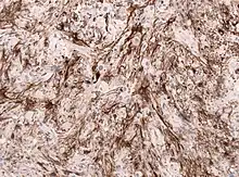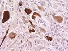 Histológicamente, son características de la lesión las células gigantes astrocíticas; sin embargo, la morfología de las células tumorales puede variar desde células poligonales con citoplasma vítreo y núcleos ganglioides hasta células fusiformes en una matriz fibrilar. Las células tumorales muestran una expresión variable de GFAP, S-100, sinaptofisina y neurofilamentos.