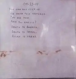 ![]() Una carta enviada al líder de la mayoría del Senado Tom Daschle que contenía polvo de carbunco mató a dos empleados postales | ||