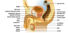El sistema reproductivo masculino incluye testículos, testículos rectos, conductos eferentes, epidídimo, glándulas accesorias sexuales, conductos accesorios sexuales y genitales externos.[3]