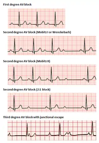 - Bloqueo AV de primer grado, cuando los impulsos que pasan desde las aurículas a los ventrículos disminuyen su velocidad. En el ritmo electrocardiográfico se observa un intervalo PR mayor a 0.20 segundos.[1]