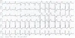 ![]() Ampliación del complejo QRS en derivación V1 y V6 por bloqueo de rama izquierda. | ||