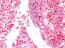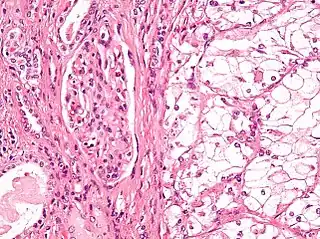 ![]() Micrografía que muestra el tipo más común de cáncer de riñón (carcinoma de células renales de células claras). Tinción H&E. | ||