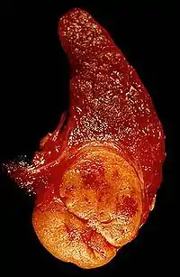 ![]() Sección macroscópica de un carcinoma folicular de tiroides (redondo, abajo). | ||