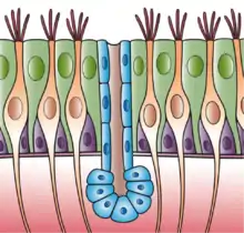 Las células basales son cuboidales, con un gran núcleo, pocos orgánulos y microvellosidades dispersas. Las células basales están adheridas a la membrana basal y la recubren.[1]