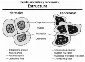 La forma, el tamaño, la composición de proteínas y la textura del núcleo a menudo se alteran en las células malignas. El núcleo puede adquirir surcos, pliegues o hendiduras, la cromatina puede agregarse o dispersarse y el nucleolo puede agrandarse. En las células normales, el núcleo suele ser de forma redonda o elipsoide, pero en las células cancerosas el contorno suele ser irregular. Diferentes combinaciones de anomalías son características de los diferentes tipos de cáncer, en la medida en que la apariencia nuclear se puede utilizar como marcador en el diagnóstico y la estadificación del cáncer.[6]
