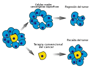 La célula madre cancerosa es un tipo hipotético de célula madre que formaría tumores mientras que tendría las propiedades de las células madres como autorrenovación y la habilidad de diferenciarse en múltiples tipos de células. Una teoría sugiere que dichas células persisten en los tumores como una población distinta y causa la recaída y la metástasis al dar crecimiento a nuevos tumores. El desarrollo de terapias específicas apuntadas a las células madre cancerosas esperan mejorar la supervivencia y la calidad de vida de los pacientes con cáncer, especialmente para los que sufren de metástasis.