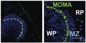La zona marginal (ZM) del bazo, contiene múltiples subtipos de macrófagos y células dendríticas entrelazadas con los linfocitos B (MZ B en inglés). Esta zona marginal no se forma completamente en roedores hasta 2 a 3 semanas después del nacimiento y pasados de 1 a 2 años en humanos.[3]