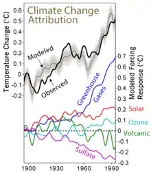 La atribución del calentamiento global a la actividad humana se basa que los cambios observados no son consistentes con la variabilidad natural, las causas naturales (no antropogénicas) conocidas tienen un efecto de enfriamiento en este período, y los patrones de cambio en las causas antropogénicas conocidas son coherentes con los cambios observados en el clima.Gases de efecto invernadero
