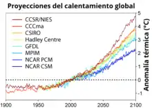 Se han proyectado escenarios de emisiones, estimaciones de los cambios en los niveles futuros de emisiones de gases de efecto invernadero, que dependen de evoluciones económicas, sociológicas, tecnológicas y naturales inciertas.[104] En la mayoría de los escenarios, las emisiones siguen aumentando durante el presente siglo, mientras que en unos pocos las emisiones se reducen.[105][106] Las reservas de combustibles fósiles son abundantes y no van a limitar las emisiones de carbono en el siglo XXI.[107] Se han utilizado los escenarios de emisiones, junto con el modelado del ciclo del carbono, para producir estimaciones de cómo las concentraciones atmosféricas de gases de efecto invernadero podrían cambiar en el futuro. Usando los seis escenarios SRES del IPCC, los modelos sugieren que para 2100 la concentración atmosférica de CO2 podría llegar entre 541 y 970 ppm.[108] Esto es un 90-250 % mayor a la concentración en el año 1750.