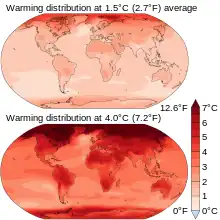 Los efectos del calentamiento global incluyen efectos ambientales, sociales, económicos y de salud. Algunos ya se observan y otros se esperan a corto, mediano o largo plazo (con diverso grado de certeza); algunos son localizados y otros globales;[155][156] algunos son graduales y otros abruptos; algunos son reversibles y otros no; algunos pueden tener consecuencias positivas,[157] pero la mayoría son adversos.
