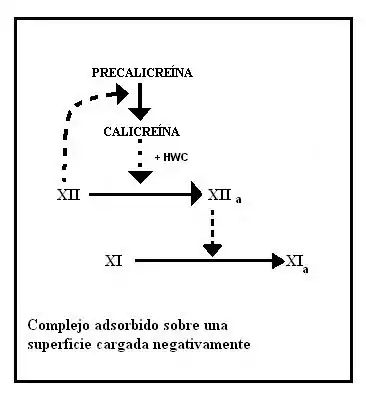 El zimógeno de proteinasa FXII se une directamente a alguna superficie aniónica (etapa independiente de iones calcio) y sufre un cambio conformacional que aumenta su capacidad catalítica de 104 a 105 veces. La procalicreína y el FXI circulan en la sangre formando complejos independientes con el quininógeno de elevada masa molecular (HMWK): los complejos FXI-HMWK y procalicreína-HMWK. El FXI y la procalicreína se unen a los sitios aniónicos de las superficies de membrana expuestas a través de sus interacciones con el HMWK. Esta interacción lleva estos zimógenos al lugar de la herida y en proximidad directa con el FXII. La forma “activada” de FXII unida a membrana activa la procalicreína para producir calicreína. La calicreína actúa catalíticamente sobre FXII para dar FXIIa, una enzima mucho más activa. Esta actividad catalítica se ve potenciada por el HMWK (cofactor). FXI está unido a la membrana a través de su unión no covalente con HMWK y es activado por FXIIa a través de una rotura proteolítica para dar FXIa.