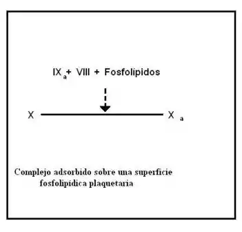 Sobre la membrana de las plaquetas se forma un complejo constituido por los factores IXa, X y VIII. Primero se unen FX y FIXa a la membrana gracias a los residuos gamma-carboxiglutamato correspondientes; actúan como quelantes del ion Ca2+ y luego se une el FVIII. El factor VIII es en realidad un heterodímero, formado por dos cadenas proteicas, cada una codificada por un gen diferente (VIII:C y VIII:R). El componente VIII:C es conocido como "componente antihemofílico" y actúa como cofactor del IXa en la activación del factor X, el componente VIII:R es el que permite la unión del factor VIII al complejo (la ausencia del VIII:C causa Hemofilia A).