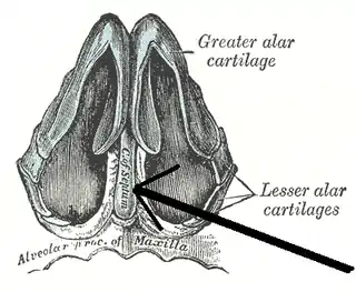 ![]() Cartílagos de la nariz, vistos desde abajo (cartílago del septo visible en color cian en la parte inferior central) | ||