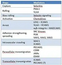 Las células sanguíneas (eritrocitos, leucocitos y plaquetas) son producidas por la hematopoyesis. Los eritrocitos tienen como función principal la entrega de O2 a los tejidos, y esta transferencia se produce por difusión y está determinada por la tensión de O2 (PO2). Los eritrocitos son capaces de sentir la necesidad de O2 de los tejidos y de causar un cambio en el calibre vascular, a través de la vía de liberación de ATP, que requiere un aumento del cAMP, y están regulados por la fosfodiesterasa (PDE). Esta vía se puede desencadenar a través de dos mecanismos: el estímulo fisiológico (como la reducción de la tensión de O2) y la activación del receptor de prostaciclina (IPR). Esta vía incluye las proteínas G heterotriméricas, la adenilciclasa (AC), la proteína cinasa A (PKA), el regulador de la conductancia transmembrana de la fibrosis quística (CFTR) y un conducto final que transporta el ATP al lumen vascular (pannexina 1 o canal aniónico dependiente del voltaje (VDAC)). El ATP liberado actúa sobre los receptores purinérgicos de las células endoteliales, desencadenando la síntesis y la liberación de varios vasodilatadores, como el óxido nítrico (NO) y la prostaciclina (PGI2).[39][40] El modelo actual de cascada de adhesión leucocitaria incluye muchos pasos mencionados en el cuadro 1.[42] La adhesión mediada porp integrina de los leucocitos a las células endoteliales está relacionada con los cambios morfológicos tanto en los leucocitos como en las células endoteliales, que en conjunto apoyan la migración leucocitaria a través de las paredes venulares. Las pequeña GTPasa Ras y Rho están involucradas en las principales vías de señalización leucocitaria que subyacen a la adhesión dependiente de la integrina estimulada por la quimiocina, y tienen importantes funciones en la regulación de la forma, la adherencia y la motilidad de las células.[41]