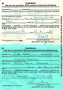 En Alemania, el Certificado Internacional de Vacunación según ley[15] se expide para todos los recién nacidos desde 1962 y, además, está disponible en todos los médicos de cabecera o (para los profesionales de la medicina) a través de la Deutsches Grünes Kreuz con sede en Marburg.