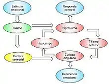 El circuito comienza cuando un estímulo emocional se presenta, este llega directamente al tálamo, de donde va a la corteza sensorial y al hipotálamo. Cuando la información proveniente de estas dos estructuras es integrada por la córtex cingulado o corteza cingulada ocurre la experiencia emocional, es decir, las sensaciones se convierten en percepciones, pensamientos y recuerdos. Papez demostró que la corteza cingulada y el hipotálamo están interconectados mediante el núcleo anterior del tálamo, el hipocampo y los cuerpos mamilares, y que estas conexiones son necesarias para el control cortical de la expresión emocional.