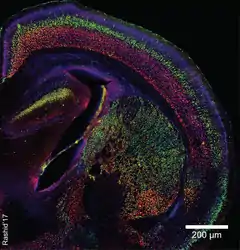 Cito-arquitectura de la Corteza cerebral. En diferentes colores, se ven los somas de las neuronas, dispuestas en las diferentes capas. Corteza de ratón. Microscopio confocal.