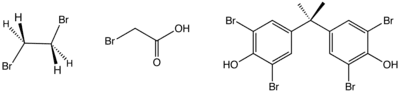 Estructura de los tres compuestos organobromados industrialmente más significativos. De izquierda a derecha: Bromuro de etileno, ácido bromoacético y tetrabromobisfenol A.