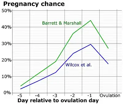 ![]() Probabilidad de fertilización por día en relación con la ovulación.[1] | ||