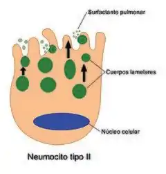 Los cuerpos lamelares son orgánulos intracelulares especializados y tienen la función de almacenamiento y secreción de ciertas sustancias lipídicas como el surfactante pulmonar. La secreción se realiza por un proceso de exocitosis que se inicia mediante la fusión de la membrana del orgánulo con la de la célula, lo que permite que la sustancia almacenada en el interior del cuerpo lamelar se libere al exterior. Un neumocito tipo II contiene entre 120 y 180 cuerpos lamelares que se forman y destruyen en un proceso continuado.[3]