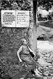Sin embargo, en ciertas ramas del budismo japonés, las mujeres que menstrúan sí que tienen prohibido asistir a los templos.[39] En el budismo de Nichiren (Japón), la menstruación no se considera un obstáculo espiritual para la práctica religiosa, aunque una mujer que menstrúa puede decidir no inclinarse, por comodidad.[40] Durante la menstruación, las mujeres no deben entrar en los templos o santuarios, ya que se consideran contaminadas. En el budismo de Sri Lanka, esto también se aplica a sus esposos y a otros hombres que hayan estado en un hogar con mujeres que menstrúan.[41]