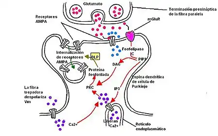 La DLP en el cerebelo ocurre en la sinapsis de las células de Purkinje, ellas reciben dos formas de estimulación excitatoria: una de parte de fibras trepadoras y la otra de fibras paralelas. La DLP disminuye la eficacia de la transmisión de las fibras paralelas.[8] Para que DLP ocurra ambas fibras requieren ser activadas simultáneamente. Por una vía, fibras paralelas sueltan glutamato para activar a los receptores No NMDA, principalmente a los AMPA (α-amino-3-hydroxy-5-methyl-4-isoxazolepropionic acid) y kainato, y también a los receptores metabotrópicos de glutamato en la parte postsináptica de las célula de Purkinje. Cuando glutamato se adhiere al receptor AMPA, la membrana se despolariza. Pero cuando glutamato se adhiere al receptor metabotrópico, diacilglicerol (DAG) es producido junto con inositol trifosfato (IP3); un segundo mensajero de la transducción de señal celular. En la vía iniciada por la activación de las fibras trepadoras, calcio entra en la célula postsináptica a través de los canales iónicos dependientes de voltaje, incrementando niveles de calcio intracelular. Juntos, DAG y IP3 aumentan la concentración de la concentración de calcio al activar la proteína quinasa C (PKC, del inglés protein kinase C). La PKC fosforiliza receptores AMPA, esto da como resultado la internalización de los receptores de AMPA. Con esta pérdida de receptores AMPA la respuesta de la célula de Purkinje postsináptica es menos sensible a la liberación de glutamato desde las terminaciones presinápticas de las fibras paralelas.[8]