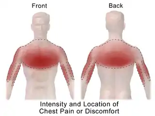 - Infarto de miocardio ("ataque de corazón"): las personas suelen quejarse de una sensación de presión o compresión sobre el pecho.[15] Otros síntomas asociados son: sudoración excesiva, náuseas, vómitos y debilidad.[15] El dolor torácico se asocia más frecuentemente con un infarto anterior debido al deterioro del ventricular izquierdo ; el infarto inferior se asocia más frecuentemente con náuseas, vómitos y sudoración excesiva debido a la irritación del nervio vago ; el infarto lateral se asocia con dolor en el brazo izquierdo.