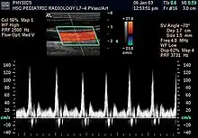 - Doppler color: La información sobre la velocidad y dirección del flujo en tiempo real se representa con unidades de color.[23]