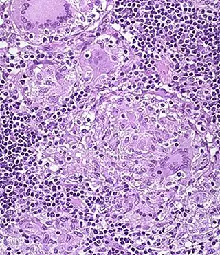![]() Sección H&E de granuloma no caseado, en el colon de paciente con la enfermedad de Crohn | ||
