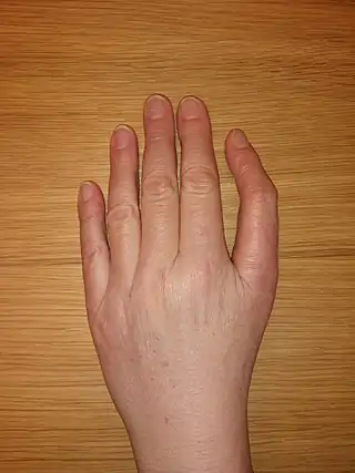 ![]() Malformación del pulgar que a veces acompaña a la ADB | ||
