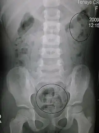 Estreñimiento visto a través de rayos X. Los círculos representan áreas de materia fecal (las heces están rodeadas de blanco debido al gas de los intestinos).