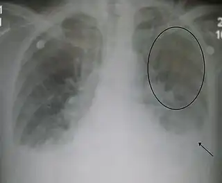 La disminución en el gasto cardíaco ocasiona un incremento en la presión diastólica final del ventrículo izquierdo (PDFVI), aumentando así la presión en la aurícula izquierda. Ello se transmite hacia atrás como congestión de los vasos bronquiales que drenan en la aurícula izquierda a través de las venas pulmonares causando edema de la mucosa bronquial, obstrucción al paso del aire (disnea) y aumento de la secreción de moco bronquial, que causa ruptura de pequeños vasos, extravasación de glóbulos rojos y expectoración sangrienta (hemoptisis). Adicionalmente, el aumento en la presión en el territorio venocapilar pulmonar trae como consecuencia el paso de líquido y células al espacio alveolar, empeorando la relación ventilación-perfusión.