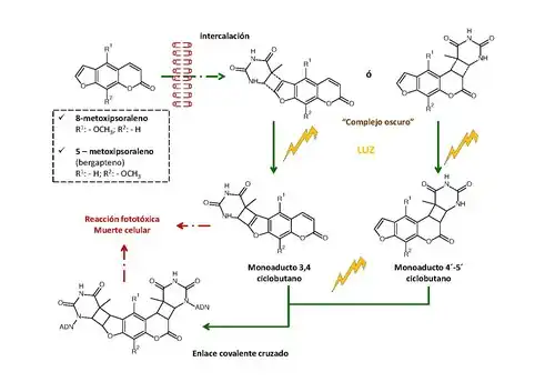 El mecanismo de fototoxicidad (figura 1) es de tipo no fotodinámico.[4][3] Cuando los psoralenos penetran en las células, acceden al núcleo donde se intercalan con el ADN y forman lo que se denomina "complejos oscuros". La absorción de energía forma un monoaducto 3,4 o 4,5 ciclobutano con bases pirimidínicas (citosina y timina) del ADN. Así, se forma un complejo de inclusión cíclico que enlaza el psoraleno con el ADN. La absorción de un segundo fotón determina un aducto bifuncional que forma un enlace covalente cruzado con un resto de base pirimidínica de cada una de las hebras de ADN. Esto conduce a la inhibición de la reparación y la síntesis de ADN y desencadena la reacción fototóxica, pudiendo producir la muerte celular.