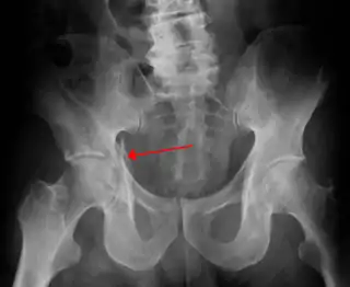 ![]() Radiografía en la que puede visualizarse una fractura de acetábulo | ||