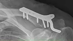 ![]() Radiografía de una fractura completa de la clavícula del hombro izquierdo. | ||