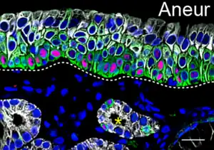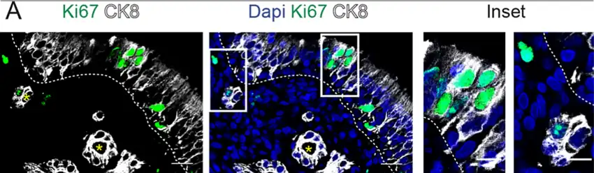 Las células de las glándulas de Bowman están "ciclando" como se demostró en núcleos dispersos marcados para Ki67. Ki67 es una proteína nuclear expresada en todas las fases del ciclo celular, excepto durante la fase de reposo y el comienzo de la fase G1. Fuera del epitelio, células Ki67 positivas están presentes en la parte externa de las glándulas de Bowman subepiteliales de la lámina propia.[2]