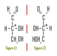 Un gliceraldehído es una aldotriosa cuya fórmula es C3H6O3. Posee dos isómeros ópticos, ya que tiene un carbono asimétrico, representado como C* en la figura 1.