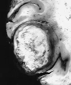 ![]() Examen macroscópico. Esta variedad gigantocelular del glioblastoma muestra una masa sólida y compacta que radiológicamente podría confundirse con un carcinoma metastásico. | ||