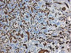 - ↑ Hufnagel, T. J., Kim, J. H., True, L. D., Manuelidis, E. E. (1989). «Immunohistochemistry of capillary hemangioblastoma: immunoperoxidase-labeled antibody staining resolves the differential diagnosis with metastatic renal cell carcinoma, but does not explain the histogenesis of the capillary hemangioblastoma». The American Journal of Surgical Pathology 13 (3): 207-216. PMID 2465700.