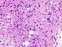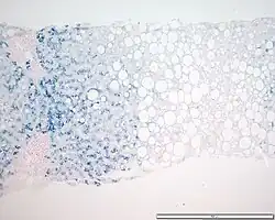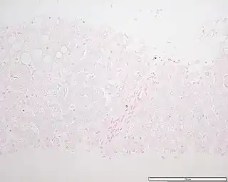 ![]() Preparación teñida con azul de Prusia para revelar depósitos de hierro; muestra un patrón típico de acumulación de hierro de la hemocromatosis genética en heterocigosis (véase coloración azulada al ampliar la imagen). | ||