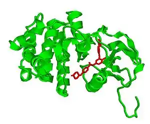 Bcr-abl quinasa, que causa LMC, en verde, inhibido por una pequeña molécula de Imatinib mesylate, en rojo.